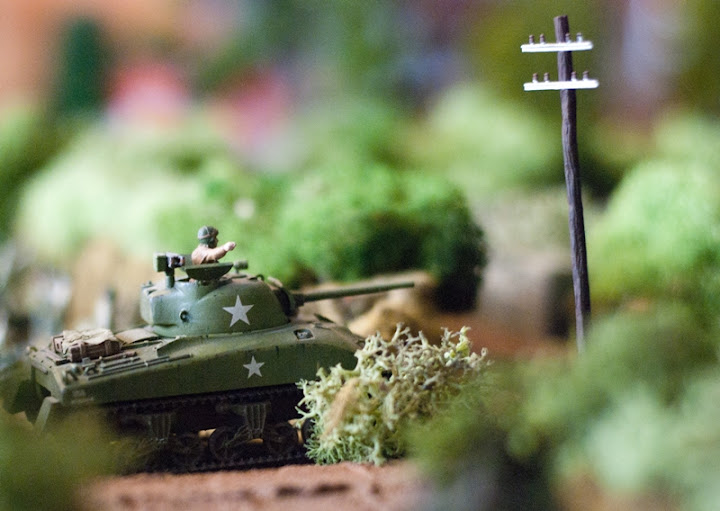| Shermany dołączają się do walki - nękają ogniem uwijających się przy pakowaniu Niemców... |
