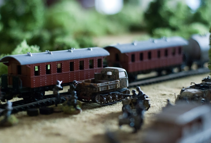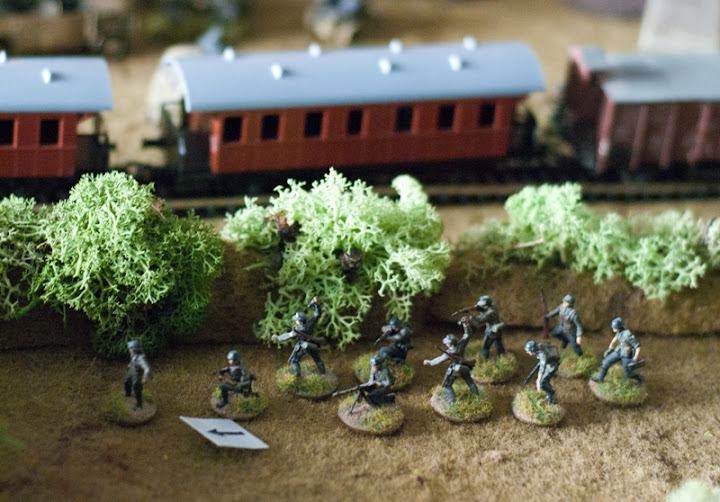 Dziś będzie wesoło, wałkowaliśmy ostatnio scenariusz wymyślony "na kolanie" w pięć minut w luźnej, niedzielnej konwencji rozegrany na stole u Bnk. Cała akcja toczyła się gdzieś we Francji kiedy to pluton niemiecki został oddelegowany do "ratowania" co cenniejszych pakunków i towarów z pociągu ostrzelanego przez alianckie Thunderbolty. Tory na trasie jazdy pociągu zostały rozerwane w wyniku eksplozji bomb - cudem transport jakoś ocalał, ale żeby sukces był wymierny - trzeba ratować to co w pociągu jechało a więc broń i amunicję... Jakby tej nerwówki było mało w okolicy operują już od dawna bandy rozproszonych spadochroniarzy amerykańskich oraz pancerne oraz piesze siły inwazyjne...