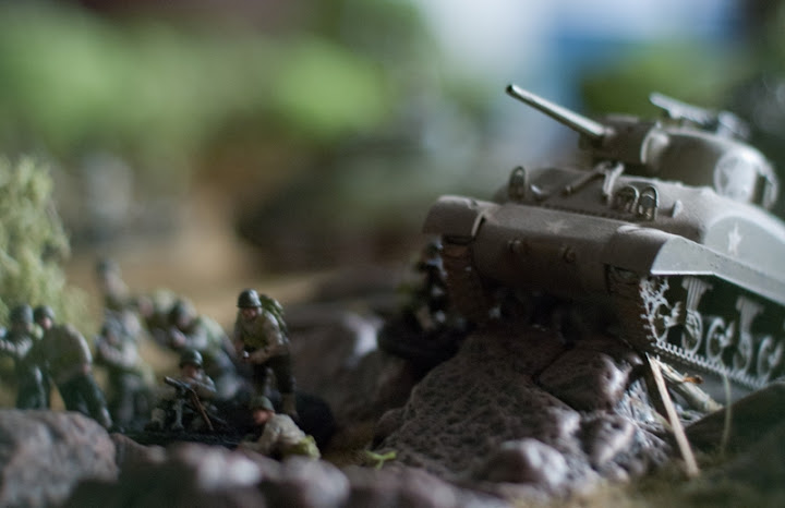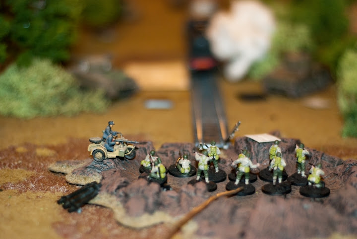 | Obstawa generała Amsel'a przed zruinowaną cegielnią - miejscem przesłuchania jeńca z SAS... |